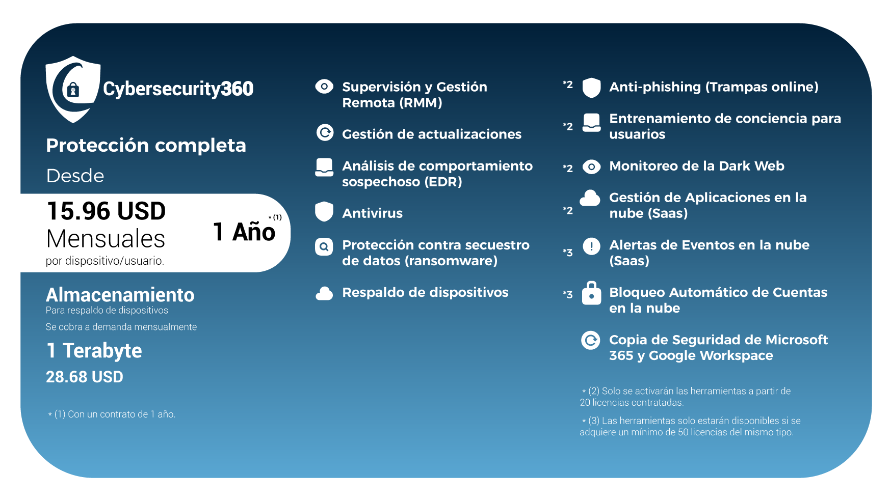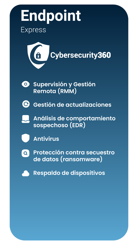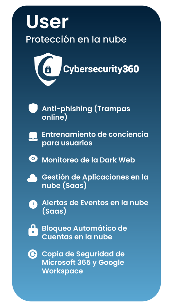 Si requieres ampliar tu plan, contamos con soluciones específicas como Cybersecurity Endpoint (protección para equipos) y Cybersecurity User, (protección Saas) diseñadas para adaptarse a tus necesidades.